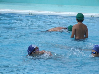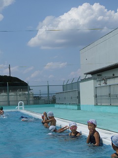 |   | 校長室の「先生あのね」「人は夏に育つ」 2  全部で3日間ですが、水泳が得意でない余り泳げない子を対象に水泳教室が実施されています。 30名くらいが希望して午後からプールで練習します。 「泳げた」今日一日でだいぶ上達しているのがわかります。 いつもよりより丁寧に指導している少人数の効果は、本当に泳げるようになります。練習量と時間は本当に嘘をつきません。コツを覚えることと、体を動かすことで力(筋力)がつき上達していると思います。 しかし、 何よりも子どもたちの「泳げるようになりたい」という願望の強さ、これが一番のように思います。目標を持ち励まされることでより刺激され達成するのだと思っています。 夏休み始まり、まず一つ、成果がありました。 まだ後2日あるので休まず頑張りましょう。 豊里小の先生方も一緒にプールに入り指導してくださいます。お世話になります。