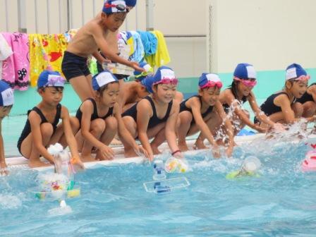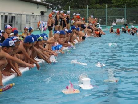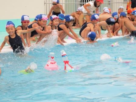 図工の時間に作った作品をプールに浮かべてあそびました。