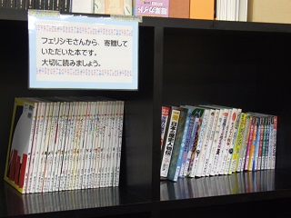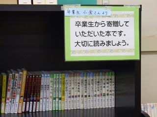 卒業生の保護者の方から、児童に今興味ありそうな本をたくさんいただきました。 ありがとうございました。 子どもたちの為に少しでも役に立てばと・・・。学校を地域を思う気持ちが嬉しいです。 図書室の棚にコーナーとして入れ替えてで設置しました。購入した新刊も同じですが、いただいた本でも心がこもっています。皆さんも大切に使いましょう。 そして、どしどし利用しましょう。人気の本ですよ! |