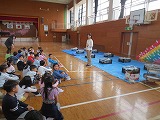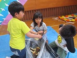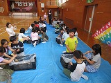 体育館で、シートを広げた上で、みんな手に手にたけのこをもって、皮をむきました。