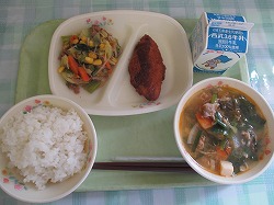 牛乳 ご飯 あじフライ 豚キムチスープ 野菜炒め