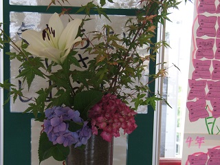 |   | 校長室の「先生あのね」潤いのある花が・・・ 昇降口にはあじさいの花が、6月の季節感を醸しだしています。 雨に似合う花ですが、このところ雨がふりませんでした。 しかし、この昇降口には、児童の皆が一冊一冊ずつ読んで一言感想を書いてくれた紫陽花の花が咲き乱れています。面倒でも読んだ後に、紹介の花をのりで丁寧に貼ってくれました。見事にいっぱい咲いています。全校合わせたその量にも驚きますが皆さんの感想の一言にさらに感心しています。 「楽しかった。」「面白かった。」だけでなく、何が、どのように面白かったと。わずかの紙のスペースに想いを込めて記入してあるのです。 だから雨がなくても潤いを感じるのかもしれません。艶のある紫陽花を感じます。着々と読み続けています。このような活動の姿にも、着実な実力が身についていると思っています。 |