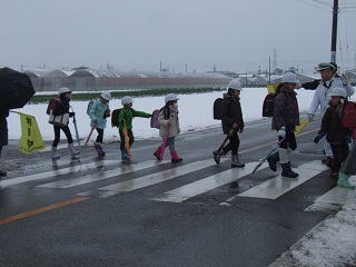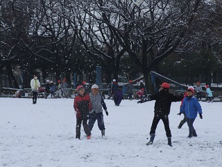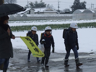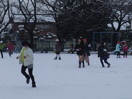 |   | 校長室の「先生あのね」またの雪に 大喜び  先日に続き積雪です。連続は珍しいです。天からの贈り物に子どもたちは テンション高く登校しています。 気温が前回よりも高いため、水分が多く直ぐに解けるような気がします。 スリップ事故も多く報告されているため、通学路・脇道等の積雪は多く、安全を確保しての2時間遅れの本日です。 ともあれ、朝のうちしか雪遊びはできないと思い。楽しんでいました。 特に高学年が喜んでいたのは、ストレス発散なのか、いろいろと悩みもある年頃ですが 無邪気に仲間とはしゃいでいる姿に、ホッとしまだまだ子どもらしいさを感じました。