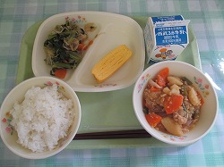 牛乳 ご飯 厚焼き玉子 じゃがいものそぼろ煮 煮浸し