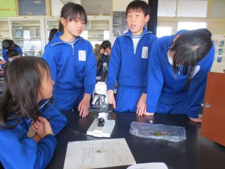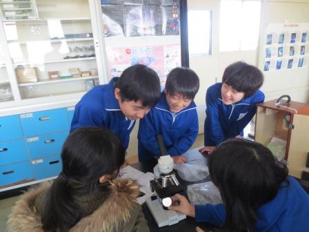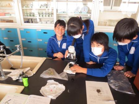 理科の単元の学習は終了したので、本日は顕微鏡の使い方を復習しました。朝、校庭で観察したいものを一人一人探していると砂や草、花びらはもちろん、鳥の羽や苔など多くの物を集めてくる子どもたち。そして、2時間目に使い方の手順を復習し、グループごとに観察しました。顕微鏡を通して見ると、予想とは異なる様子に子どもたちも驚いていました。また、身近にある広告や食塩なども観察し、新たな発見もあったようです。