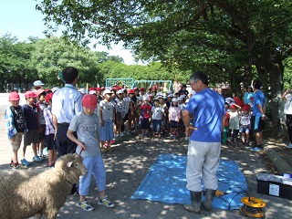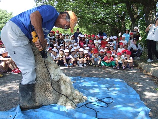 動物園の様子をテレビで見たことがありますが 目の前で、見たことがある子は初めてのようです。 地域の羊を飼っている農家の方が、よかったらということで見せてくださいました。なかなか見られないことなので見学しました。 みんなも驚きの様子で見守っていました。 今年昨年の11月に生まれ、6ヶ月で60キログラム 羊の成長は早いのも驚きました。 この羊さんにとっても刈り込むのは、初めの体験で羊も緊張しています。 また、皆がみているのでさらに、恥ずかしく驚いているようです。 刈り取った毛は100%ウール、ちょっと固いようでふわふわです。 羊のことがいろいろ知りたくなりました。 子どもたちの思いも様々の幼です。 刈り取らないとドンドン増え、夏暑くて大変だそうです。 また、刈り取られて羊にとっては気持ちがいいとのことです。 バリカンで少し血が出てしまいましたが、これは、羊にとっては人間が蚊に刺されたようなもので、全然大丈夫のようです。安心しました。 ほんのわずか見るだけでしたが、羊の刈り取った毛のように心もふっくらした経験ができました。有り難うございます。 この毛を頂きましたが、どのように洗うのか、何に利用すればよいか・・・。 よいアイディアがあったら教えてください。