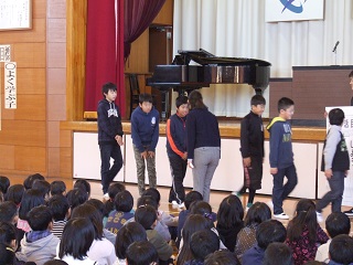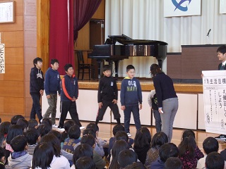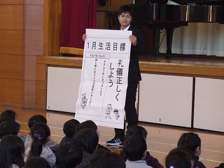 1月の生活目標です。 ○礼儀正しくしよう ・すすんであいさつをしっかりしよう ・時と場におうじた言葉づかいをしよう 「豊里しぐさ」 パタパタトン 右の右の思いやり ・にこりぺこりふんわり 5年生の代表がよいあいさつと、悪いあいさつの見本を見せてくれました。 みんな分かっています。しかし、できるかどうかは あなた次第、これが自立の一歩でもあります。
