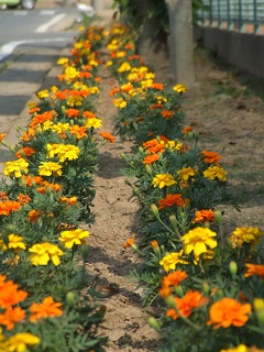 |   | 校長室の「先生あのね」 美しさにおっとり 仲間で育ててる これは、5月の花*花活動でボランティアの皆さんと、飼育栽培委員会、児童会が植えたマリーゴールドの花です。 成長して花がつきました。交互に色分けしたのがよかったです。 綺麗に並んでいます。明るさ、温かさを感じます。学校が豊かに感じます。皆さんの心が込められています。水やりもコツコツと責任を持って進めています。このような仲間がいる学校です。自慢です。 たとえ、水やりを忘れてもそれをフォローしてくれる仲間もいます。枯れれればそこで途切れますが、続くの心ある仲間がいるからです。それが飼育や栽培の仕事に責任感を育てます。 決して、たまたま育ったのではありません。美しさを享受するだけでなく、美しくあるための責任をも学んでいます。