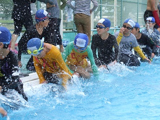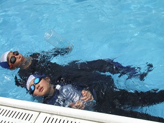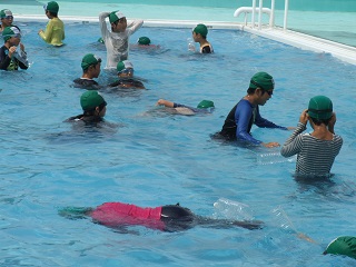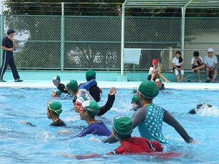 |   | 校長室の「先生あのね」 体験は一生もの   水の事故のシーズンに備え、万が一を考えて着衣泳を実施しました。 知識や技を体験してもらうために水泳指導の半分を利用しています。 服を着た状態で泳ぎ、その抵抗の大きさ、体力消耗を体感したり、いざの時に慌てないためです。 さらに、ぺッとボトルひとつでも、浮くことができることなど体験しました。 胸の前に当てる、両足で抱え込むなど、呼吸や浮く動きの助けになる使い方等です。しかし、決して自ら救助に向かうのではなく、自分が万が一の時の対応として学びました。 水は怖いものです。しかし、浮きの姿勢や対処の方法がある程度かっていると分かっていないでは、冷静さが違うと思います。 私も今日慌てた瞬間に、水を飲み込み気管に入ってしまいました。即、苦しくなり立ってしまいました。足のつかないところだときっと、泳げても危なかったと思います。水を飲んでしまった一瞬の苦しさ、恐怖が勉強になりました。