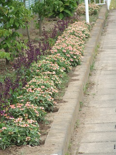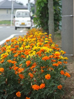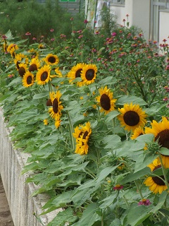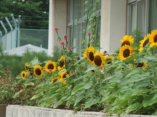 |   | 校長室の「先生あのね」花壇から応援、夏に育つ仲間  暑さに負けないひまわりたちが勢揃い 校舎前の花壇を一番先頭で彩り、プール、算数補習、水泳教室の友達を「おはよう」 「頑張れ」と応援しています。 もっと多くの友達に見てもらいたいですが、咲く時期が少しずれて残念です。その場で元気に咲いて豊里小児童を応援しているだけではもったいないので、ホームページでお知らせして各家庭に応援のメッセージを届けました。 そして、裏の花壇は、マリーゴールドたちが後ろから応援しています。 「人は夏に育つ」の合い言葉 日直等の先生方の水やり、除草など感謝します。 |