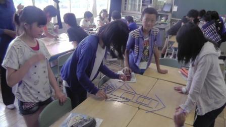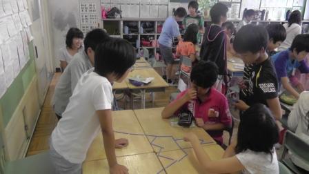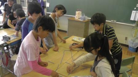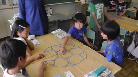 本日、外国語活動の時間は、4年生の田久保先生とメアリー先生が行いました。4年生で行う授業を事前に6年生で実践してみたわけですが、6年生も非常に意欲的に取り組めました。英語でスティックを集め、それを使ってグループごとに好きな形を作りました。