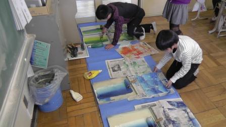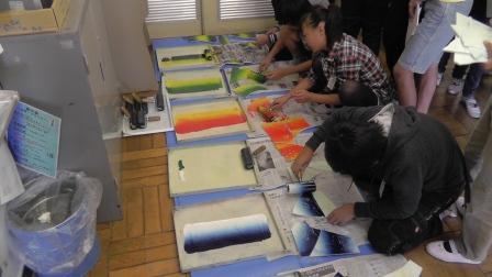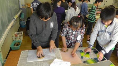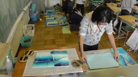現在、図工の授業では「うつして見つけたわたしの世界」という単元で、版画を行っています。5年生まで行っていた彫刻刀を扱うものではなく、身のまわりの物を使用し、スチレンボードに模様や型をつけていきます。鉛筆やコップ、キャップなど様々な物で模様をつけたり、線の太さを変えたりと工夫が感じられました。本日はそれらを紙に刷って、仕上がりました。一人一人模様は異なり、きれいなグラデーションがかかった作品が多く見られました。