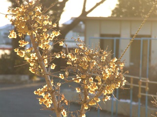 |   | 校長室の「先生あのね」春の始まり 立春を過ぎ春を強く意識する如月 太陽が昇り光りに照らされて、蝋梅の艶やかで透明感のある黄色が暖かそうに美しく光っています。 しかし、まだまだ早春賦の歌詞と同じ気持ちです。 校長室前の春の始まりを感じさせる狼狽の花、子どもたちも同じように光りを浴びています。1年間のまとめ・準備の時期として力強くこの寒い時期を勉強・運動・生活と事故なくしっかりと過ごしていきます。