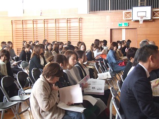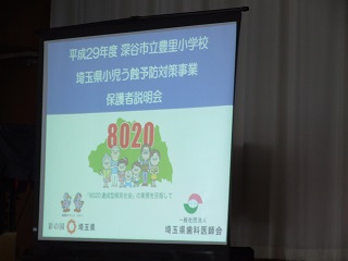 8020 一生使う自分の歯  今年度より埼玉県歯科医師会で推奨しているフッ化物洗口を実施し、むし歯になる率を防ぎたいと思います。昨年度に本校歯科校医さんの勧めで計画準備して参りました。今年度の6月よりフッ化物洗口を始めます。そのための保護者説明会を行いました。 今までに、職員はフッ素の扱い方、児童洗口の方法とその指導について研修を済ませ、今回は保護者の皆さんへの理解と協力を求めました。 総会前の短い時間でしたので、ご質問や心配等ある方は、学校保健室まで遠慮なくお願いします。