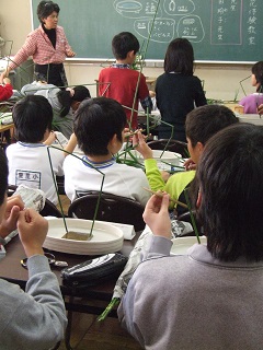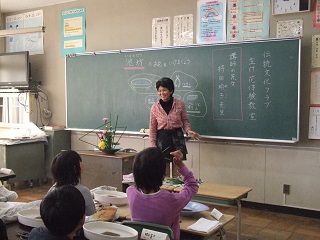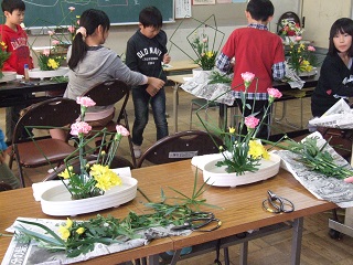 |   | 校長室の「先生あのね」生け花(池坊流)を学ぶ  伝統文化クラブでは、今回は生け花をやりました。 公民館より花器等の道具をお借りしました。 本格の池坊の講師の先生が1時間で子どもたちに生け花体験をさせる計画です。 始めに見本を先生が示し、これと同じように生けることになりました。子どもたちは、目の前の見本をまねて・・・、少し技を教えてもらいながら・・・ 中には力を入れすぎて。剣山指がぶつかって「痛い!」という子もいましたが、それも経験、茎の下をもたず力任せに刺したら、茎が折れてしまうのです。しかし、少しコツを覚えると・・・楽しかった。に声が変わりました。 子どもちの作品は昇降口に飾ってあります。授業参観日は是非見てください。 生け花は、後で手直しができるので、先生も一人一人について直してくださいました。 ありがとうございます。子どものそれぞれの作品(生け方)を活かしての手直しです。 作品というのは、同じものは2つとないものなんだと感じました。 だから、凡人はいません。みんな名人です。 でも、先生の生け方は、生きがいい、切れがあり、粋と水盤に浮かんでいるような感じがします。同じ植物なのに生け方で見え方が違います。奥が深いです。 ありがとうございました。