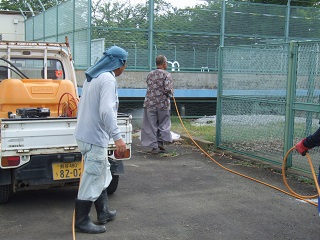 |   | 校長室の「先生あのね」地域の力ここにもあり 夏休みが始まり、校庭教室も校庭も子どもたちが学校から家に戻りました。 子どもたちがいなくなると、急に校庭には雑草が、今かと待ち受けたように生え始めます。成長の恐ろしさはみるみる驚きです。足の踏み場もないくらいの雑草は根も深く、早めの対応が必要です。 早速、それを見越して学校運営協議会でも決定したとおり、地域環境整備ボランティアの方が、機械で除草に来てくださいました。有り難いことです。 広い学校をわずかな時間に・・・ 午後の子どもたちのいない時に安全を配慮しての散布をご理解ください。