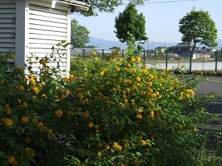 3スズラン 4矢車草 5八重山吹 まだまだいろいろな花 新緑の葉の色にマッチしている白、黄色、紫、赤・・・の花 自然の植物の様々な色に改めて、神秘、美しさを感じます。 天気のいい今日は 目に飛び込んでくるようでした。 きれいです。 豊里小の春は真っ盛り