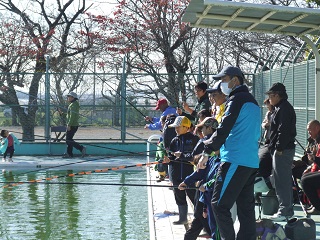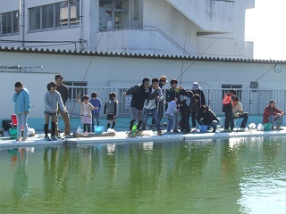 公民館主催のマス釣り大会を覗いて見ました。 天気もよい秋の釣り堀に太公望達が集まりjました。(学校のプール) 5年くらい前から続いています。 以前は利根川で実施していたようですが 話によれば。利根川は蛇が出たり、子どもが万が一落ちたら危険な川です。(体験話より) また、豊里地区は釣り堀になる適当な川が見あたらないとのことのようです。 毎年の地域の楽しみとしてのマス釣り、毎回釣り堀を作る予算をかけるなら、その分魚をいっぱい入れて楽しんだほうがよい。とのことで 「命」優先で学校も協力しています。 取り切れなかった魚は全部その日のうちにすくい取りプールの衛生については約束です。 当日は、子どもも楽しみで、23匹も釣った家族があったようです。 すごいですね。
