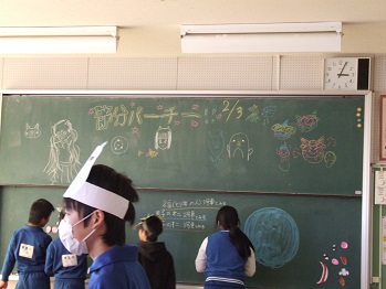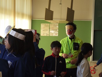 |   | 校長室の「先生あのね」福は内 鬼は外   本日は節分、給食にも福豆が出ました。 各家庭で豆まきをすることと思います。 邪気を払い、無病息災を願う。元気なかけ声と共に豆をまく力強さが、気持をいっそう高ぶらせ心の悪いことを追い払い、よい福を入れるのだと思います。寒い冬だからこそ、その気持ちや元気は必要なのかもしれません。  寒さに負けず外で元気に遊び体を鍛える子を見て、本当に感心するし元気が出ます。このパワーが明日の豊里をつくる。 朝の寒さでも、全校で縄跳び、持久走を先生方と一緒に取り組むチーム豊里。全員が子どもたちの教育のために一致団結して活動しているとてもよい集団があります。(体調の悪い人も昇降口で応援してくれています) 特に、教えるものは、口先だけでなく、自らも行動をしなければなりません。いつもいつも子どもたちは見ています。先生方は見ています。保護者の方は見ています。この頑張りの積み重ねが心身共に元気な人をつくるのだと思います。 私もその仲間のひとりとして、いつもいつも感謝です。 元気に 福は内 鬼は外 6年生は元気よく節分パーチーをやってました。
