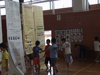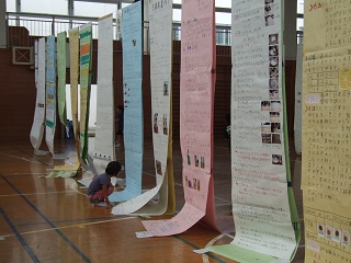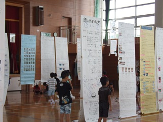 |   | 校長室の「先生あのね」今年も素晴らしい 体育館に一人一人の知・技・考が集まりました。 図画・習字・家庭科・理科などの作品です。 ものづくり、作品作りはアイディアや動機がまず大切なスタートです。 日頃からの興味・関心作りたいもの、調べたいもの、やりたいものが 次の流れを左右するからです。 また、コツコツと丁寧にデータ収集の根気、どの子も全ての力を使っているのを感じます。今年もしっかりと考えています。努力しているものが目につきました。 努力・考えは自分だけのもの 「すごいなぁ」、「いいなぁ」と本当に思います。 作品展には 努力のあとの生きる学び・智恵・豊かさ・喜びがあるなぁ 児童も友達の作品から学んでいました。 是非、校内作品展、市内作品展が開催されますので、見て頂き、さらなる自分の智恵、メタ知識にしてしてほしいと思います。