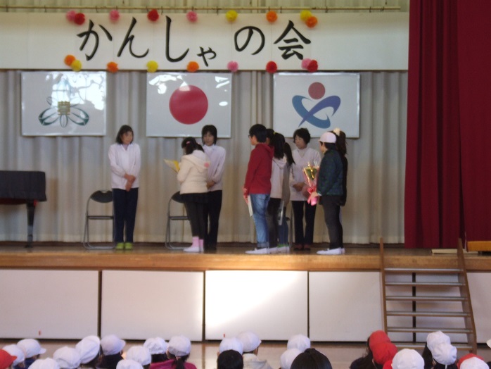 |   | 校長室の「先生あのね」感謝の心を育てる 給食週間にちなんで感謝する会です。給食週間の取り組みが続いています。 食の大切さには、栄養・エネルギー、毎日の健康、楽しく美味しく、食物の命をいただくことなど・・・。 今日は食を作っている方、目の前の調理員さんに感謝をしました。 食事といえば毎日お母さん・お父さんが作ってくださっているので、感謝するなら家庭がまず第一なのですが、気持ちも含め調理員さんにたくしました。 「感謝の心」は大切な心です。目の前の人に感謝できずに、それを想像して様々な食を作っている方に感謝はできません。子どもたちは、お礼の作文を書いたり、花束をプレゼントして気持ちを伝えたり、アーチで迎え入れ拍手するなど、いろいろな形で思いを伝えていました。 本のデータによると、お米一粒でも、多くの方の手を経て私たちの口に入る。生きるための栄養になるまでの沢山の方の努力があります。それがいろいろな食材となると、本当に多くの人が関わってくれるからこそ命をつないでいることになります。食べ物も粗末にしては無駄にしてはいけないという気持ちになります。 そこまでの想像は難しいと思いますが、このような活動が豊里の素直な子どもたちの温かい心に通じていくと思っています。 今朝も体育館では吐く息白く寒い日でしたが、給食クイズ、栄養に関わる劇など、しっかりできました。このしっかりの態度も気持ちが伝わります。 はなまるでした。