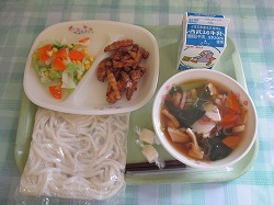 牛乳 五目うどん 大豆とポテトの揚げ煮