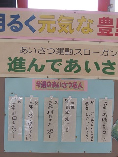 |   | 校長室の「先生あのね」 明るく元気な 豊里小 児童会のみなさん、5月の挨拶運動ご苦労様でした。 そして、昇降口には元気にあいさつができた子の名前が紹介されます。 元気なあいさつは、みんなをさらに元気にします。気持が入ります。 地域の方々からも、子どもたちの元気なあいさつや元気な声が聞けていいね。と、よく話しを聞きます。 きっと、元気の意味を肌で感じてくれているのだと思います。 沈んでいる心を元気に、元気な心をもっと元気に・・・気持が入ります。 明るく健康で、礼儀正しい豊里小の子どもたち 学校教育目標の具現化の一つ、児童会が取り組んでいる挨拶運動は、本校の子どもたちの元気を広げる大切な活動です。 皆さんもよろしくお願いします。
