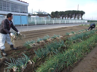 土の耕しから始まる  来年度の本校自慢のねぎ作りが動き始まりました。 それは、第2回の学校運営協議会での話し合いの一つ、ねぎが不作の解消を課題とした来年度のねぎ作り体験学習です。 不作の原因追求 ・連作からの不作や畑の水はけの問題? 提案 ・地主さんに相談して畑を交換してもらう。 ・南の使っていない畑の土と入れ替え、たい肥を入れる。 ・排水の工夫、ねぎは水が嫌いなため、畝を土地の斜面の傾斜のとおり南北につくる。 ・たい肥入には、今畑中央にある分けねぎが邪魔なため、一時抜き取り保管する。 活動 ・学校運営協議会委員のアイディアある話し合いと責任分担(ねぎ指導ボランティア・たい肥入れ・畑の南北の土入れ替えと学校事務局)で連携し作業が始まりました。 地域の方々の学校や児童に込められている思いを感じながら、事務局の学校としてできること、まず、分けねぎ堀から始まりました。