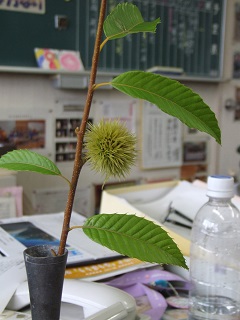 |   | 校長室の「先生あのね」気づく目・心 校歌石碑の横に栗の木があります。桃栗3年柿8年というように、昨年からなり始めた栗の実 今年は枝にたくさん実をつけています。これから秋に向けてしっかりとした実になることでしょう。 昨日、枝を刈っていたときに間違えて一つ切ってしまい。校長室に飾りました。 夏まっただ中なのに秋の気配が・・・。 すると、数人の先生方が気付いてくれました。 机の上に一輪花を飾るなんてことは積極的にはありませんでした。 一輪でも、自然を生ける。めでるというのはいいものです。風情、落ち着きを感じます。 仕事の合間に、ちょっと眺めると何か新鮮になりやる気が出ます。 これに、めざとく気付いて「わー可愛い」と、一言話してくれた先生が数人いたのです。時期的に珍しいのか、きっと同じ気持ちを抱いているかと思います。 慌ただしい中にも、一息、自分を落ち着かせ、しっかりと仕事ができる配慮あると思いました。 子どもたちの事も落ち着いて見られる。また、自然の生きを感じ雰囲気を醸し出すことができる一息と思いました。 その他にも本校では、違う方法で、やる気や配慮を醸し出している先生も沢山います。