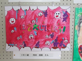 |   | 校長室の「先生あのね」8020 給食後の歯磨きの時間帯に、毎回、8020の歯磨き運動の音楽とともに 歯磨きが始まります。 歳とってから、分かることが多いものです。 その時に、困らないように健康な体、歯づくりのための呼びかける 歯磨きの習慣です。 全校で標語をつくったり、ポスターを描いたりと、歯を大切にする意識を高めます。 まだその意義が十分にからないかもしれません。その本当体験・経験は大きくなってからでしょう。 歯で噛めることの有り難さ・・・。噛むことでの健康・・・。 しかし、それでは遅すぎます。 いろいろ工夫した取り組みや紹介で歯の大切さと、大切にする習慣を身につけさせます。 さらに、大人になって分かったらまた一層大事さが分かります。