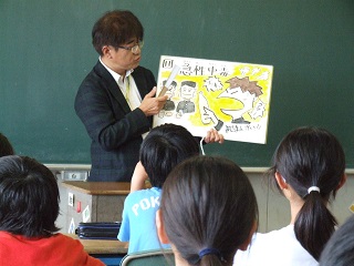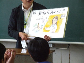 学校薬剤師の先生が6年生に紙芝居を利用して指導してくださいました。 たばこ・お酒・薬物の3つのことについて話がありました。その中でも薬物については、絶対にいけないことです。芸能人の薬物乱用等のニュースで知っている児童もいます。スター的存在の芸能人でも崩れてしまう事件がありました。 苦しいからちょっとした切っ掛けで薬物を使用してしまうことがあるようです。 楽になるからといって、最初はほんのちょっとした切っ掛けで、知り合いから進められたりして使用するようです。1回位は大丈夫だろうと興味本位で始める人もいるようです。 絶対によくないことです。これが少しずつエスカレートして、薬が切れると幻聴・幻覚が出て、最後は体がぼろぼろになる。これは、大人ならご存じのことと思います。 しかし、まだまだ子どもには、その恐ろしさは分からないと思います。私も関わったことなく、映画でしか分からないですが、いけないという意識は強いです。 例を挙げて、薬物とは知らないで、誘われてしまうかもしれません。気を付けることやいけないことを知ること、怪しい薬は断る勇気必要です。 子どもたちの姿勢のよさが、理解を深めたと思います。 少しでも、子どもたちの為にの気持で、ご指導くださり有り難うございました。 さらに、これをもとにして、今後は、子どもたちとの話し合い、気持を確かめ意識を強めていきたいと思います。