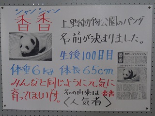 |   | 校長室の「先生あのね」名前は香香 シャンシャン 学校にも 明るい話題で心を満たせ。 早速、子どもたちは昇降口の掲示をに見入っていました。 可愛いから人気者です。 意味は 人気者 元気に育ってね。