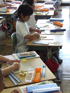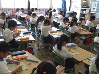 今、1年生は・・・ ピカピカの眩しい1年生、小学校では何をやるにも初めてで、その動きはまだぎこちないです。 登校の様子を見ていても、歩幅も小さいですが歩き方もゆっくりで、周囲を見て様子を判断するより長い道のりを精一杯歩くだけという感じです。 通学班長さんや班員が、本当に親切に合わせてゆっくりと安全に気をつけて、時々後ろを振り向きながら登校しています。有り難うございます。これが縦割りの親切な学びです。地域のいい子たちの仲間です。 さて、1時間目の教室を覗くと、算数ブロックで先生が黒板に示したいろいろな形を作っていました。これから算数を学習する算数セットの中身の確認や出し入れの練習です。本格的に勉強するための準備です。 何をおいても、一つ一つ勉強する前の約束です。集団生活での教室のルールなどなど、一週間は最低かかります。覚えることはたくさんありますね。 保護者の皆様へ、幼稚園や保育園と環境が違うので、疲れて帰宅すると思いますが、よろしくお願いします。