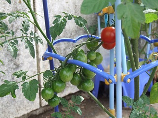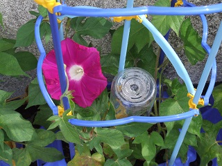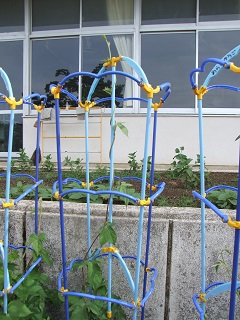 |   | 校長室の「先生あのね」わー 私のは紫だ  1年生、毎日水やりの世話をしている朝顔が咲きました。今日初めて4人咲きました。 初めて見る自分の世話している朝顔の色です。楽しみだったのか わー私のは紫、僕のは赤と歓声をあげていました。 自分が育てているものに特に興味や関心を持ち世話や観察しています。 まだ、咲いていない子も期待しながら水をやっていました。蔓がドンドン伸びています。 2年生のミニトマトも、実が鈴なりにつき赤く実っています。 実の付き方、植物の葉の形、大きさ、花、色など、目に入る情報は多数です。 教室では、学習のねらいに応じて、ポイントを絞り整理します。 低学年なので、理科的な内容は詳しく勉強しないと思いますが、 感動や気づきに 子どもたちの成長の心を感じ嬉しくなりました。