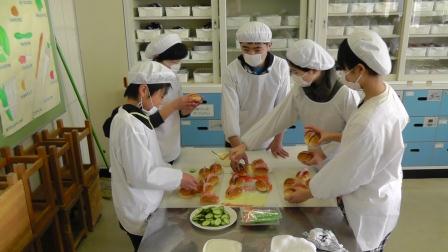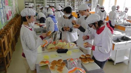 先生方の分に加え、自分たちが食べる分も合わせると多くの数になりました。班ごとに分担を決め、いざ調理開始。パンに切り目を入れる子、野菜や果物を切る子、ホイップクリームを塗る子、ゆで卵をほぐす子など、全員で協力しておいしそうなパンを作りました。できあがるとラッピングをし、先生方に渡しに行きました。先生方に喜んでもらえたようで、子どもたちも嬉しそうでした。最後に自分の分も食べて、大満足でした。